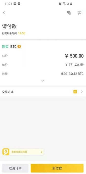 12.此时您将看到对方的收款信息。注意:使用人民币快捷买币,目前仅支持用户与用户交易,需要您按照您选择的支付方式进行线下转账。卖方的数字货币会被锁定在币安平台,您可以放心转账。完成转账后,请点击我已完成付款按钮。