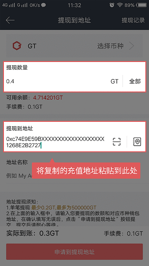 4、将复制的充值地址粘贴到提现账户的提现地址处,并输入提现数量,点击“申请到提现地址”;